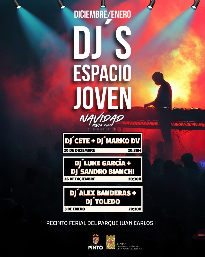 A partir de las 20:30 horas. Sesión de DJ en Espacio Jóven (Recinto ferial de Pinto) A mover el esqueleto con la mejor música en una sesión DJ de lo más navideña con DJ Alex Banderas y DJ Toledo.