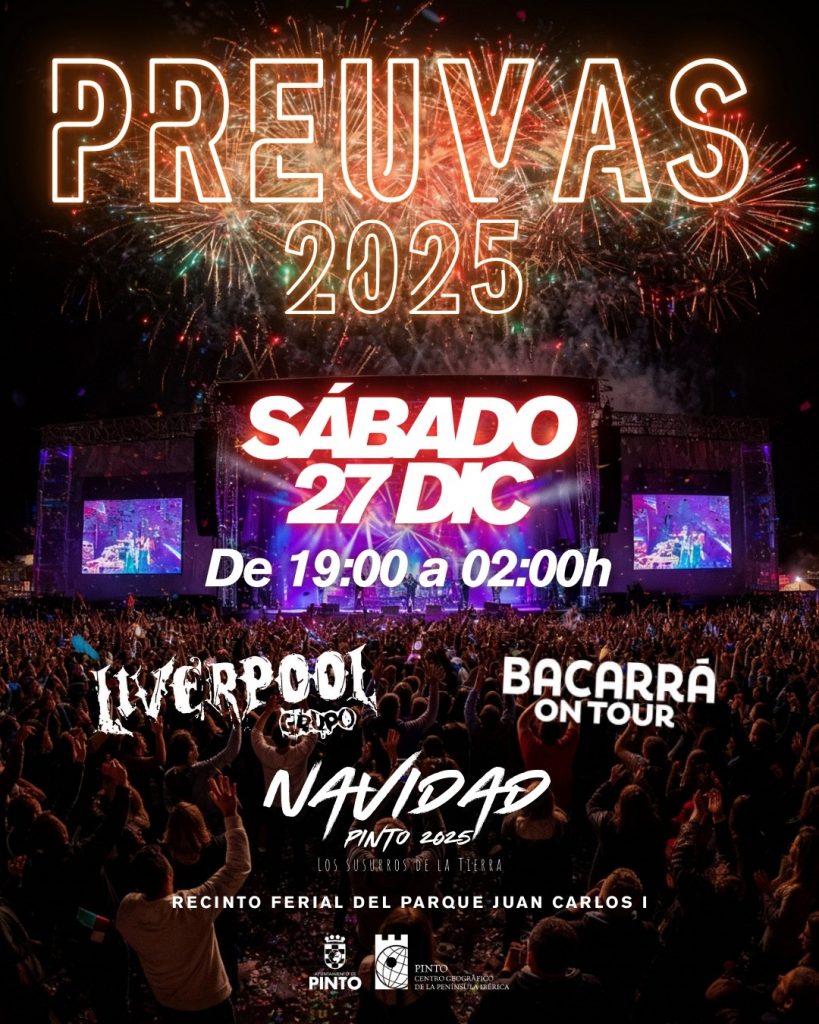 Desde 19:00 – 02:00 horas. Fiesta PreUvas 2025 (Recinto ferial de Pinto). Las PreUvas de Pinto llegan un año más para calentar motores y despedir el año con diversión y la mejor música de la mano de la Orquesta Liverpool. Posteriormente, Bacarrá on Tour será el encargado de dirigir la ceremonia para nuestras “12 Campanadas pinteñas 2025”. No te lo puedes perder. Además, habrá reparto de cotillón a partir de las 18:00 horas para los asistentes. Trae tus 12 uvas de la suerte, para que todos tus deseos se cumplan.