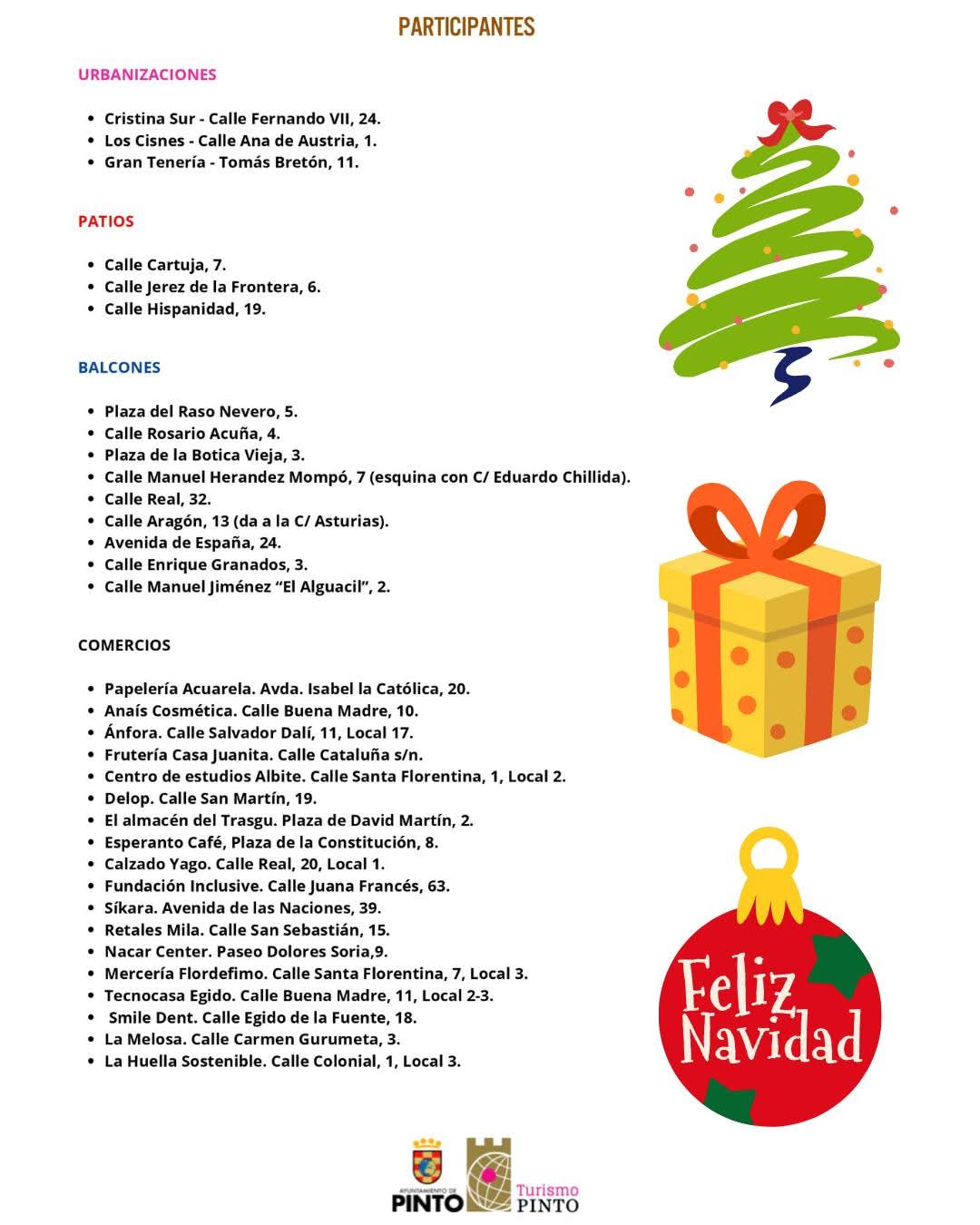 El Ayuntamiento de Pinto, a través de la Concejalía de Emprendimiento y Turismo, ha convocado una nueva edición del concurso de decoración navideña de patios, balcones y comunidades de vecinos, en el que pueden participar todos los vecinos que tengan una vivienda en Pinto, tanto si es un piso, vivienda unifamiliar o un patio de vecinos. El objetivo es fomentar el ambiente navideño de la ciudad para el disfrute de todos. El plazo de inscripción finalizó el 30 de noviembre.